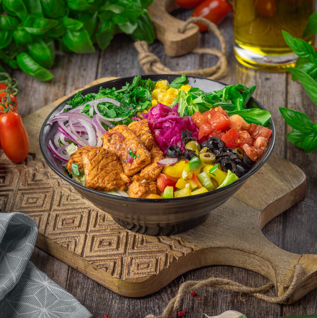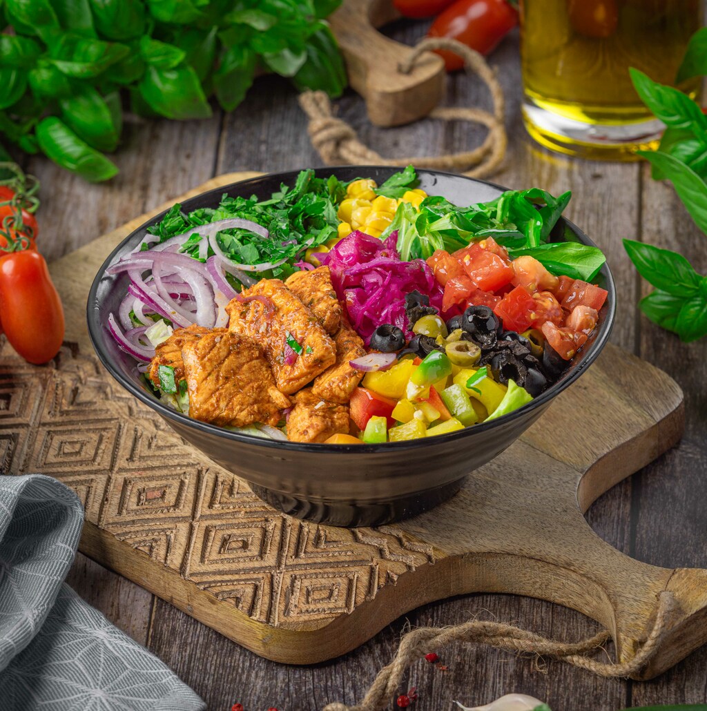 Genießen Sie unseren herzhaften Hähnchen-Salat. Wählen Sie zwischen Olivenöl, Kräutersauce oder scharfer Soße, um Ihren Salat zu verfeinern. Unser Salat besteht aus saftigem gebratenem Hähnchen, Paprika, Mais, Oliven, Cherrytomaten, Zwiebeln, geröstetem Sesam und Mandeln auf einem Bett aus frischem Rucola. Verleihen Sie Ihrem Salat mit Zitronensaft oder Granatapfelsirup eine erfrischende Note.