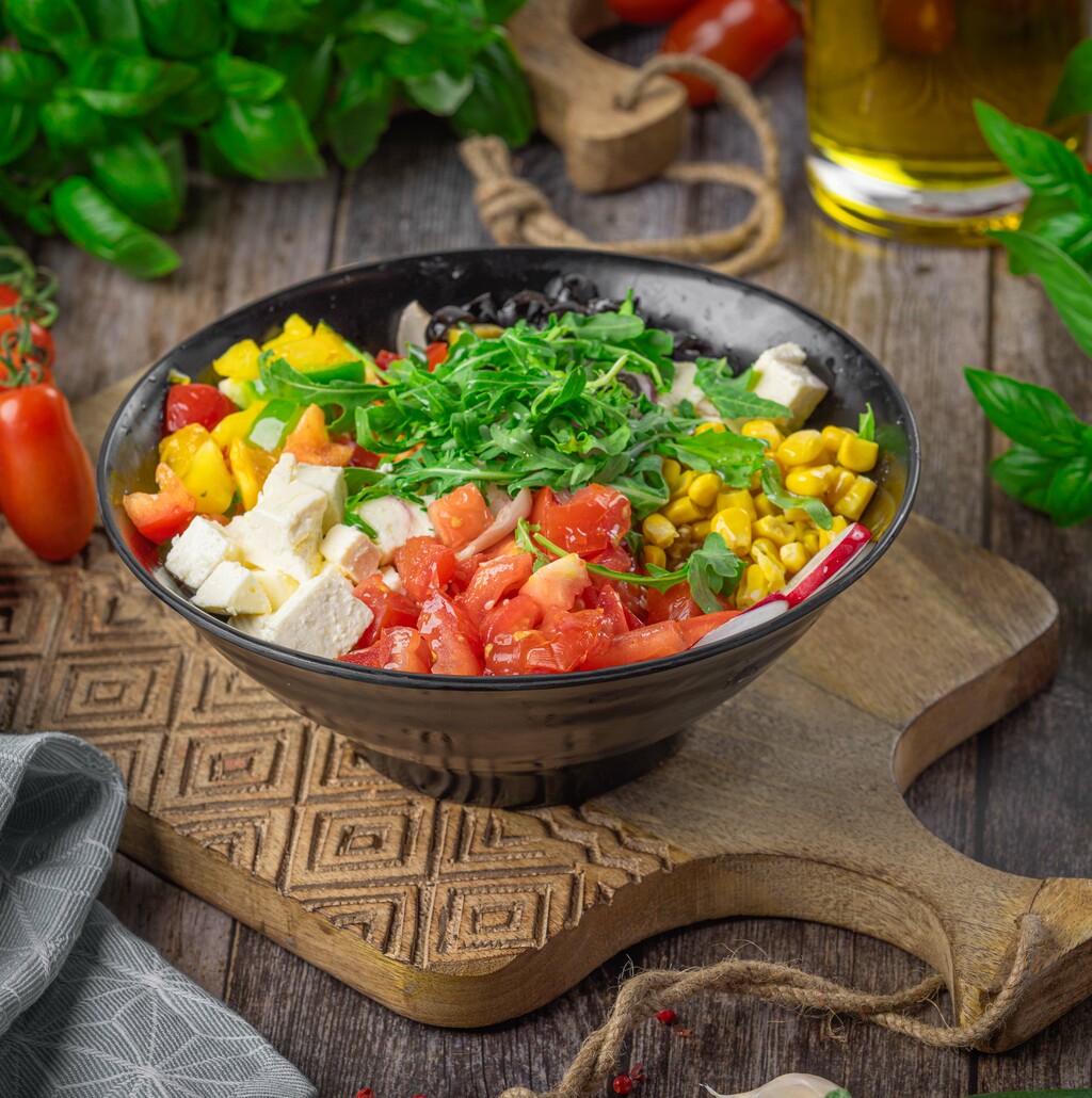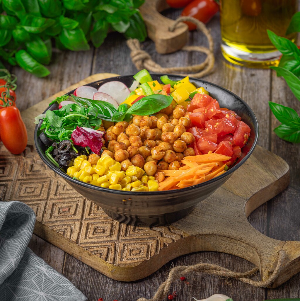 Erleben Sie unseren veganen Chickpea Salad. Serviert mit Olivenöl, veganer Sesamsoße oder scharfer Soße. Enthält herzhafte Kichererbsen, Paprika, Mais, Oliven, Cherrytomaten, Zwiebeln, geröstetem Sesam und Mandeln auf Rucola. Optional mit Zitronensaft und Granatapfelsirup.