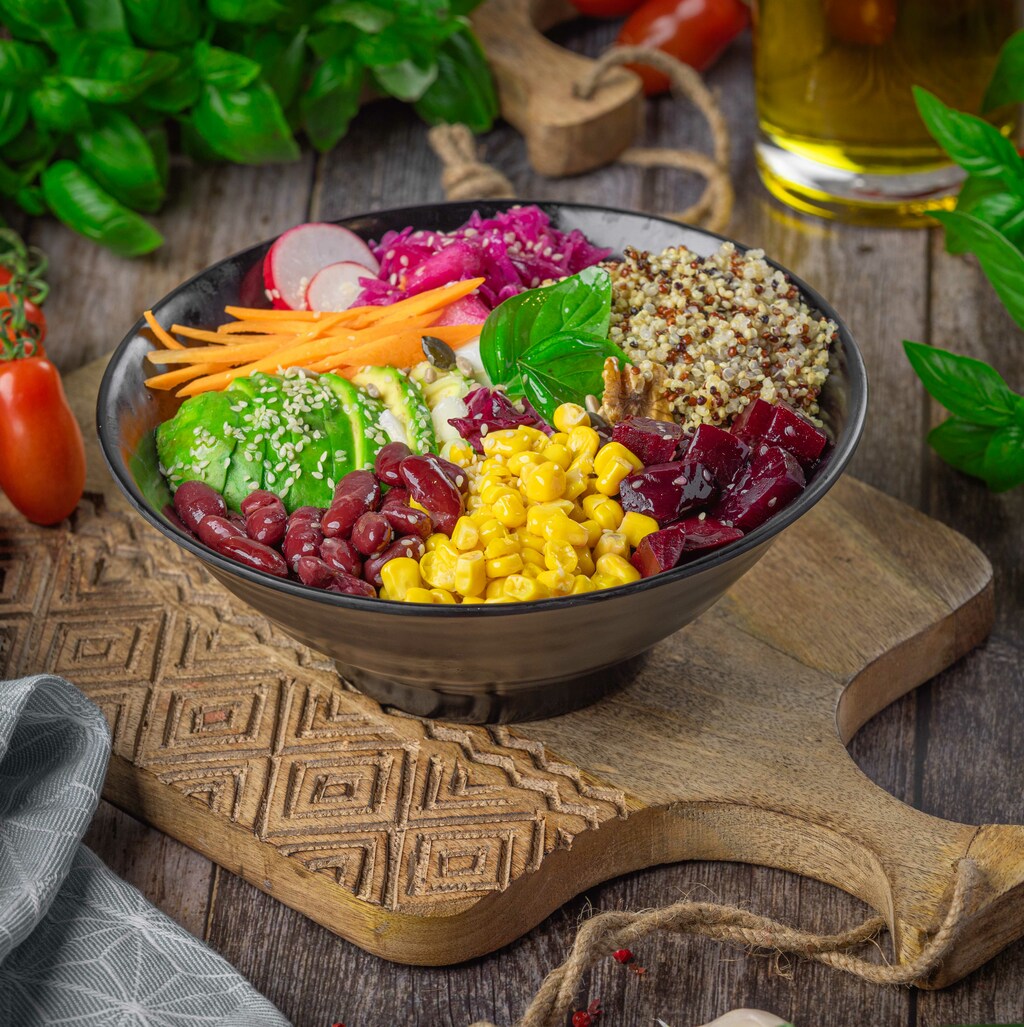 Genieße die erfrischende Leichtigkeit unserer Quinoa Avocado Bowl, die die cremige Textur von reifen Avocados mit der Fülle von proteinreicher Quinoa kombiniert. Diese Bowl ist nicht nur ein Fest für die Sinne, sondern auch eine ernährungsphysiologische Powerquelle, die dich mit essentiellen Nährstoffen versorgt. Mit einer Auswahl an frischen Gemüsesorten und einem Hauch von Zitrone ist diese Bowl perfekt für alle, die einen gesunden und dennoch geschmacksintensiven Genuss suchen. Als zusätzliche Geschmacksnote passen Granatapfelkerne perfekt dazu und verleihen dem Gericht eine fruchtige Note.