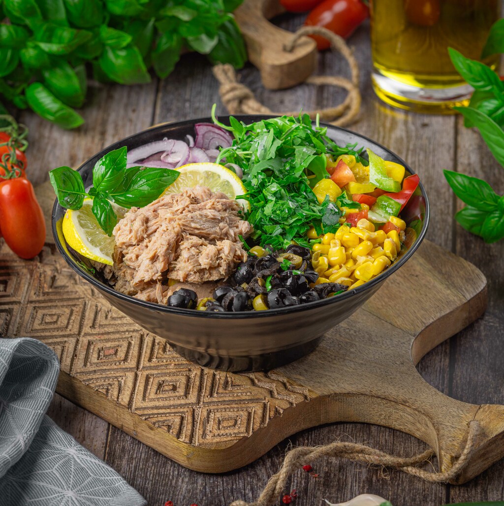 Genießen Sie unseren Thunfisch-Salat. Serviert mit Olivenöl, Kräutersauce oder scharfer Soße. Bestehend aus saftigem Thunfisch, Paprika, Mais, Oliven, Cherrytomaten, Zwiebeln, geröstetem Sesam und Mandeln auf Rucola. Optional mit Zitronensaft und Granatapfelsirup.